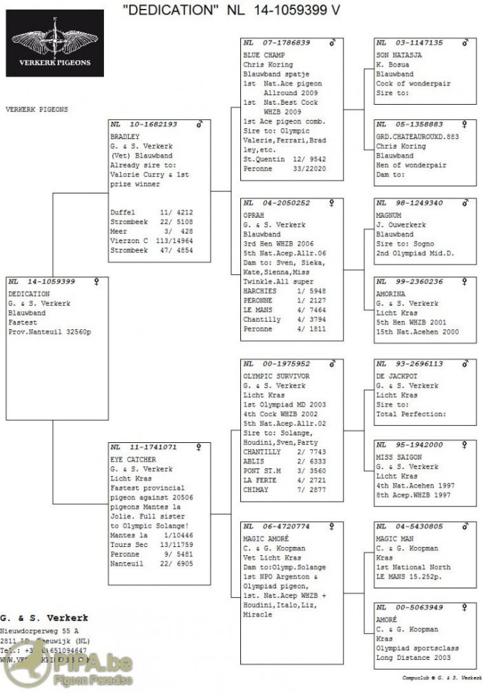 "奉獻號"是羽一歲灰母鴿,正如沃克父子的其他鴿子,此羽源于一群嚴選最高品質的鴿子:父親是灰冠軍(Blue Champ) NL07-1786839,牠曾替克裡斯.克寧(Chris Koring)拿下2009年WHZB全國雄鴿鴿王冠軍;母親是歐普拉(Oprah) NL04-2050252),曾獲2006年WHZB全國雌鴿王第3位,歐普拉的母親是矚目者號(Eye Catcher) NL11-1741071),曾獲曼特拉若利(Mantes-la-Jolie)全省20,506羽最高分速,同時也是銘鴿"奧林匹克索蘭吉"的妹妹,父母親是沃克父子的黃金配對"奧林匹克倖存者"(Olympic Survivor)NL00-1975952,2003年荷蘭奧林匹克中距離冠軍)X神奇愛神(Magic Amore),NL06-4720774)