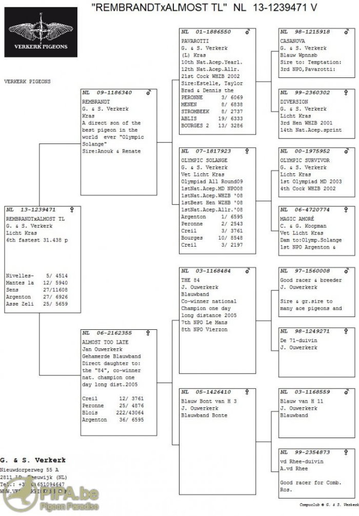 NL13-1239471此羽斑母贏得南特爾省賽31,442羽第六名,是第三只沃克父子上榜的鴿子,出自沃克舍內基礎配對:林布蘭X 驚險號(Rembrandt x Almost too late),她也是奧林匹克索蘭吉的直孫女。母親是楊.歐瓦克(Jan Ouwerkerk)的超級種公"超級484"(NL03-1168484)的直女,"超級484"替楊.歐瓦克拿下2005全國當日歸長距離鴿舍獎冠軍的頭銜。