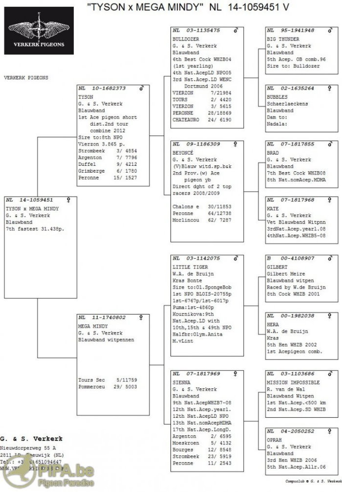 第四羽贏得南荷蘭南特爾省賽第七名的是羽一歲灰母(NL14-1059451),祖父是"推土機"(Bulldozer),NL03-1135475),曾獲2004年WHZB全國最佳雄鴿第6位以及2005年NPO當日歸長距離鴿王全國第4位,此羽冠軍鴿還贏得杜爾斯4.420羽亞軍、威爾森5.615羽第六名、威爾森21.984羽第七名。451的外祖母是"席安娜"(Sienna)NL07-1817969,曾獲2008年WHZB鴿王第9位以及亞精頓賽6,595羽亞軍。