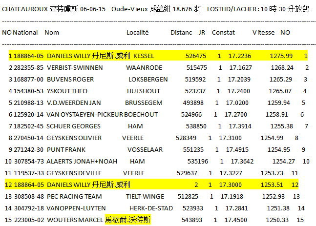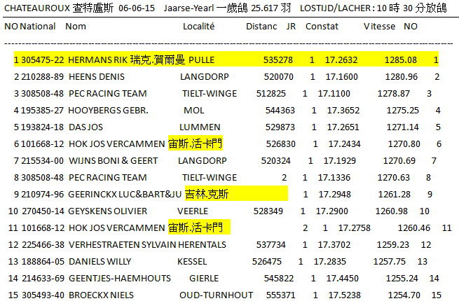 2015年比利時查特盧斯I(Chateauroux I)國家賽6月4日集鴿完成,距離約480~500公里(含成鴿18.676羽、一歲鴿25.617羽)總計44.293羽,較去(2014)年41.912羽多出了2.381羽,於6月6日(星期六)上午10時30分放鴿,天氣狀況:多雲轉晴、西北風、能見度好。