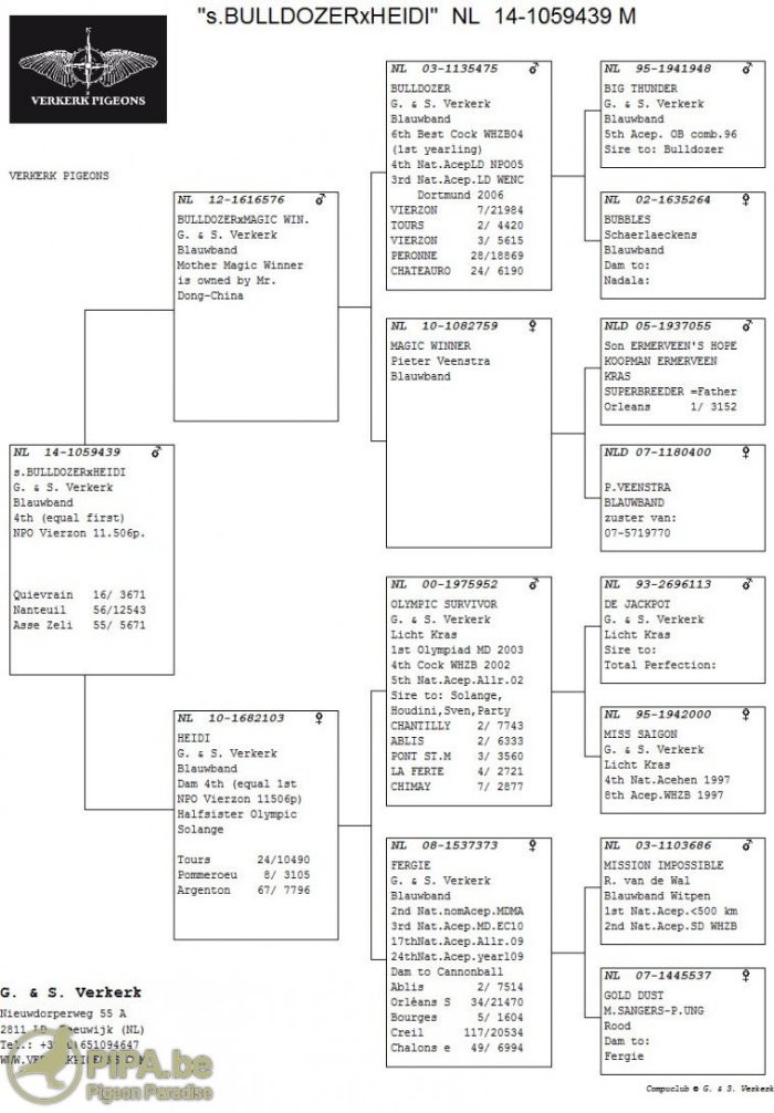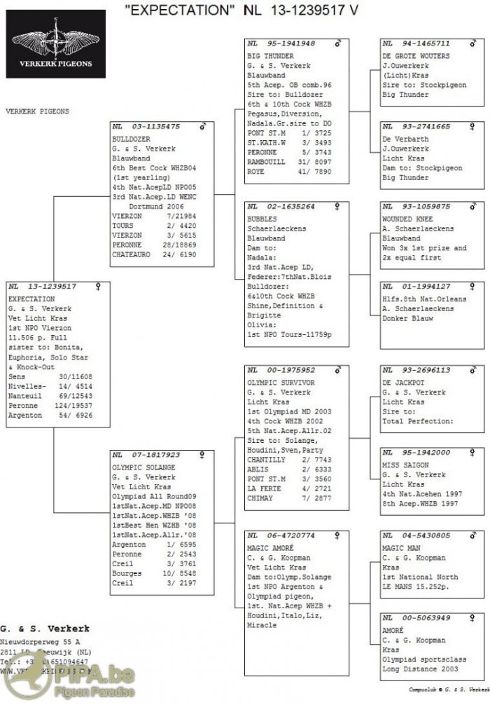 父親:"推土機"(Bulldozer),2006年西歐國家杯全國長距離鴿王季軍,2005年NPO全國長距離當日歸鴿王4位和2004年WHZB全國雄鴿6位。"推土機"作育的子代包括"伊卡路斯"(Icarus)、"飛行員"(The Aviator), "波妮塔"(Bonita), "安息香"(Euphoria)等.