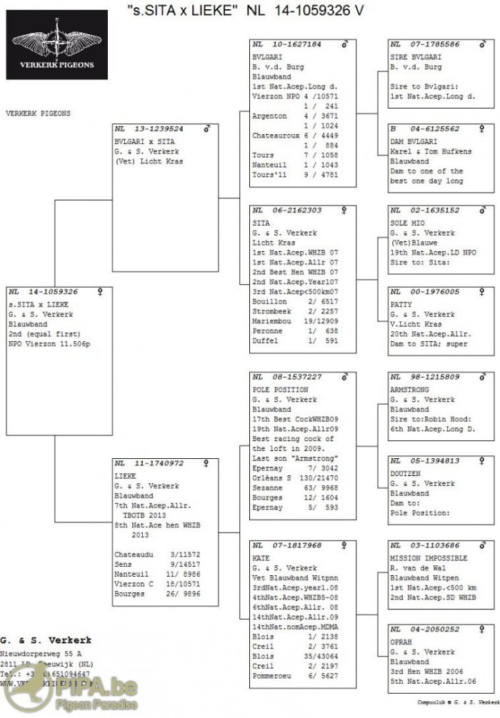 母親:"奧林匹克索蘭吉"(Olympic Solange),荷蘭60-700公里比賽最成功的賽鴿,已經贏得6項全國鴿王頭銜。她是沃克的新基礎種鴿。