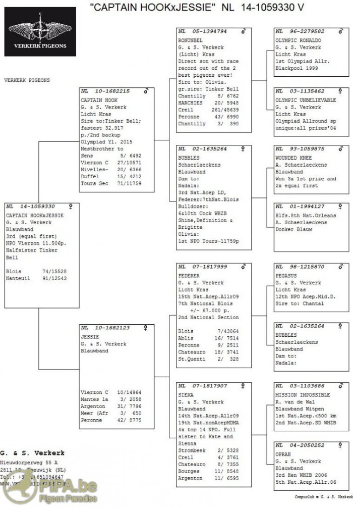 父親:"胡克船長"(Captain Hook),天賦戰將,作育子代"小叮噹"(Tinker Bell)獲得莫城全省冠軍和32917羽最高分速,2015年奧林匹克一歲鴿組後備代表鴿亞軍。
