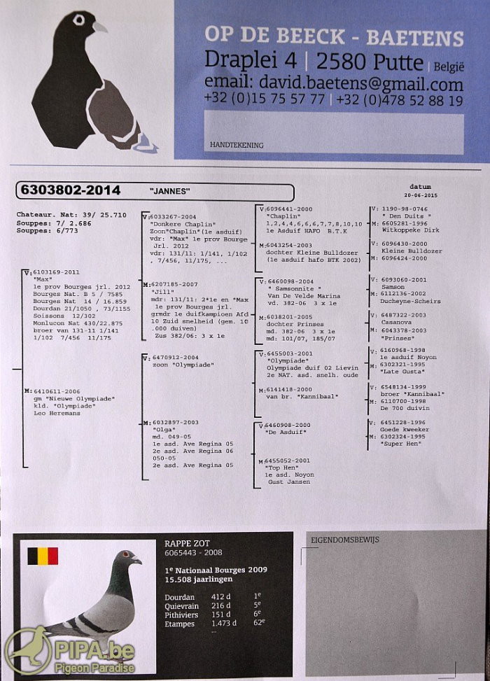2015年比利時蒙特呂松全國總鴿數27.641羽總冠軍B14-6303802灰公."詹尼斯"血統書