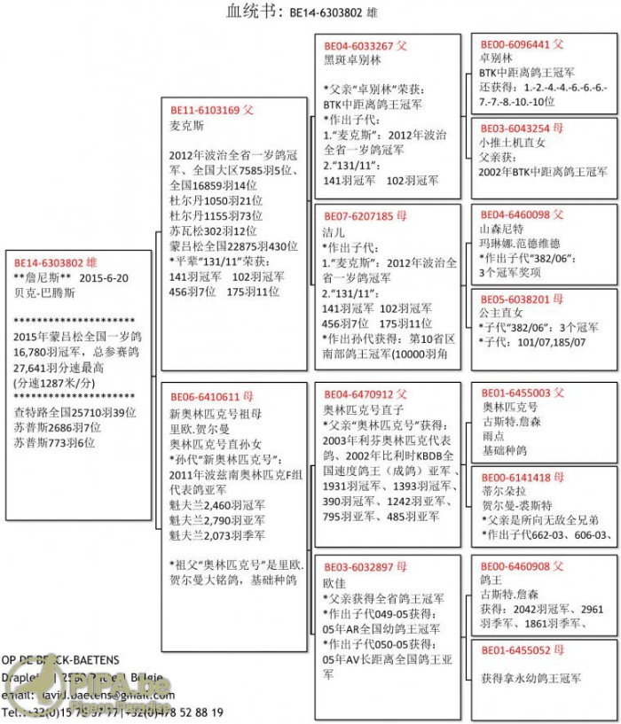2015年比利時蒙特呂松全國總鴿數27.641羽總冠軍B14-6303802灰公."詹尼斯" 中文翻譯血統書