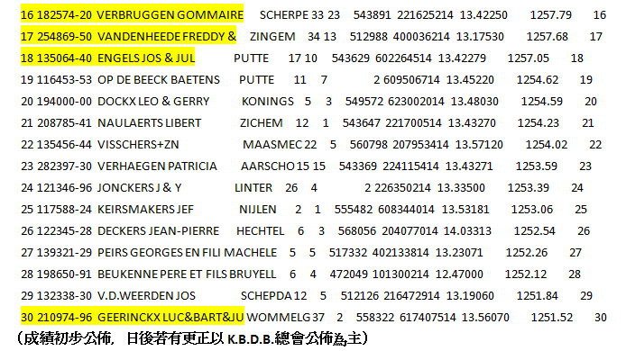 17位的福雷迪(VANDENHEEDE FREDDY)鴿舍,18位的英格斯(ENGELS JOS & JUL)鴿舍,