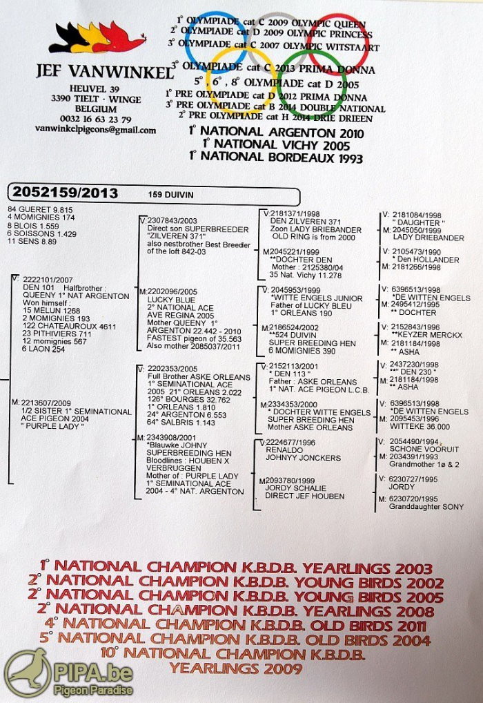 2015年比利時蒙特呂松全國賽成鴿組10.861羽冠軍B13-2052159 班母 中文翻譯血統書