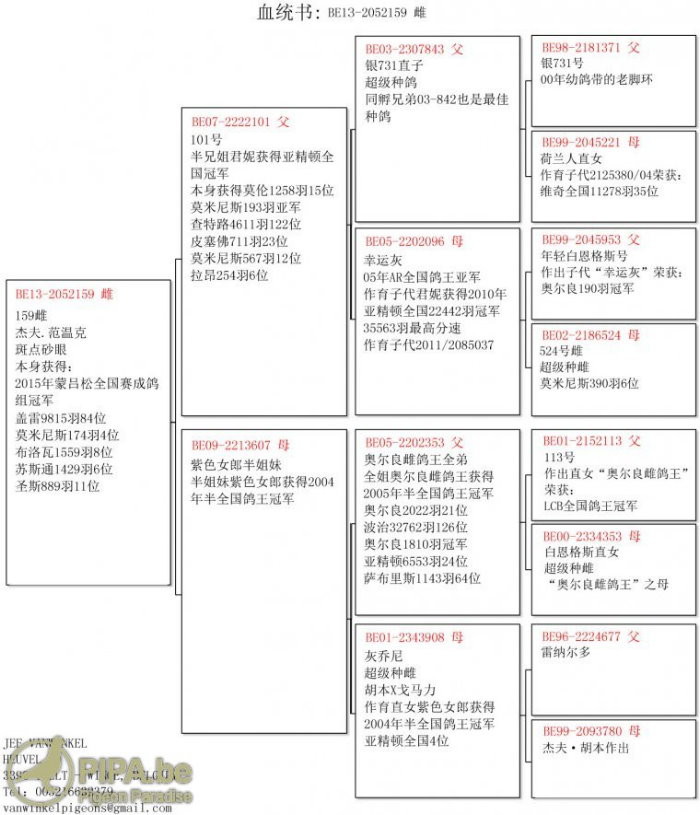 外祖父:BE05-2202353.全兄姐奧爾良雌鴿王獲得2005年半全國鴿王冠軍