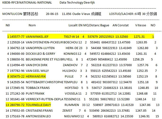 2015年比利時蒙特呂松(Montlucon)國家賽(距離約515公里)於6月18日交鴿,全國賽總參賽羽數為27.641羽(包括10.861羽成鴿和16.780羽一歲鴿),相較2014年的總上籠羽數為32.922羽,少了5.281羽。於6月20日(星期六)早上6時30分放鴿。