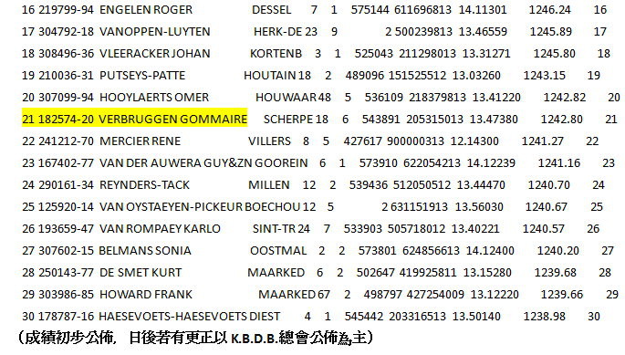 8位的范溫克 傑夫(Vanwinkel Jef)鴿舍,16位的戈瑪利.馬甸(VERBRUGGEN GOMMAIRE)鴿舍,