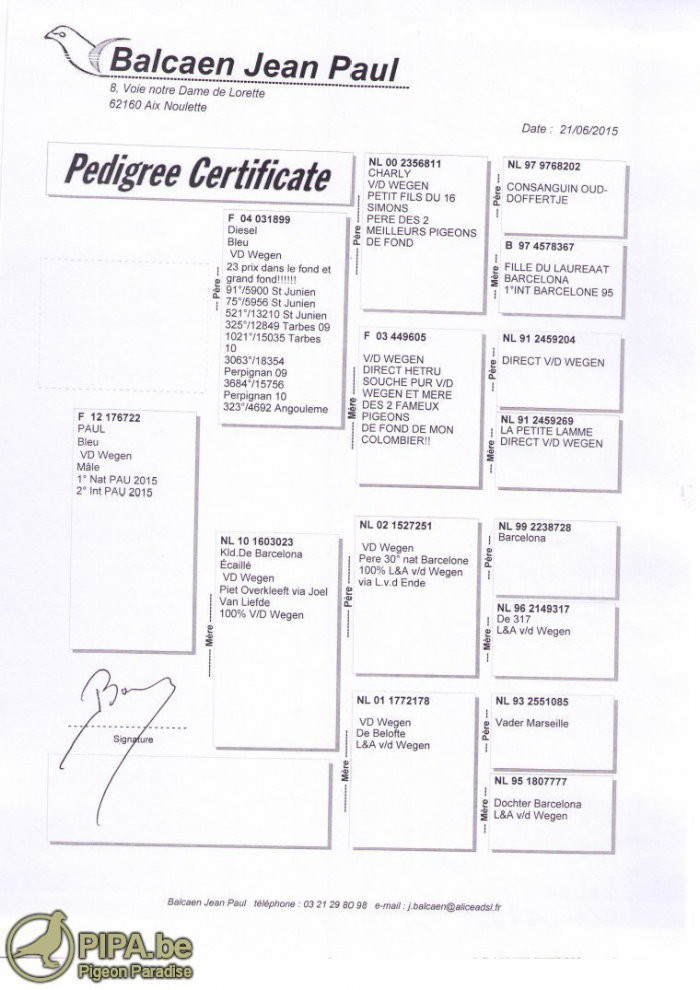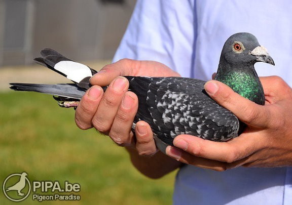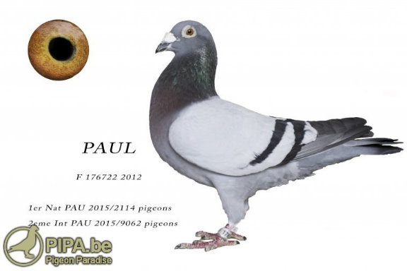 入賞波城(Pau)國際賽法國全國2.114羽冠軍(國際賽9.062羽亞軍)為巴甘恩.楊-保羅(Balcaen Jean-Paul)鴿舍,該舍冠軍鴿F176722-12灰公是在比利時時間星期五晚上21時43分0秒歸巢,翔距823.563公里,創下平均分速948.8 米/分。