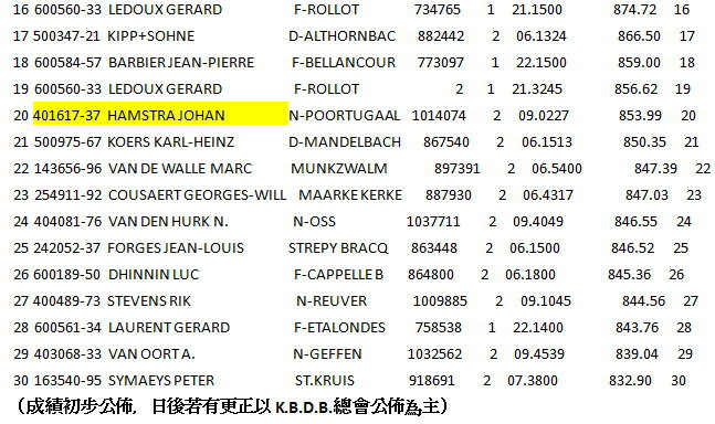 波城荷蘭全國3.433羽冠軍(國際賽9.062羽20位)為哈姆斯特拉-阿爾杜斯(Hamstra-Aldus)鴿舍