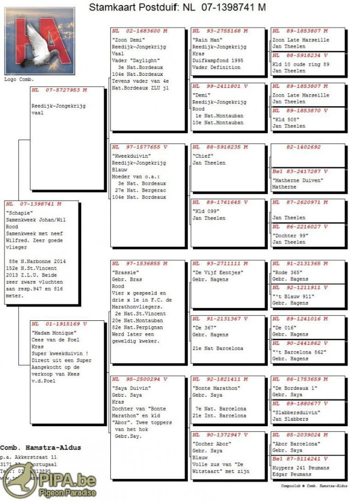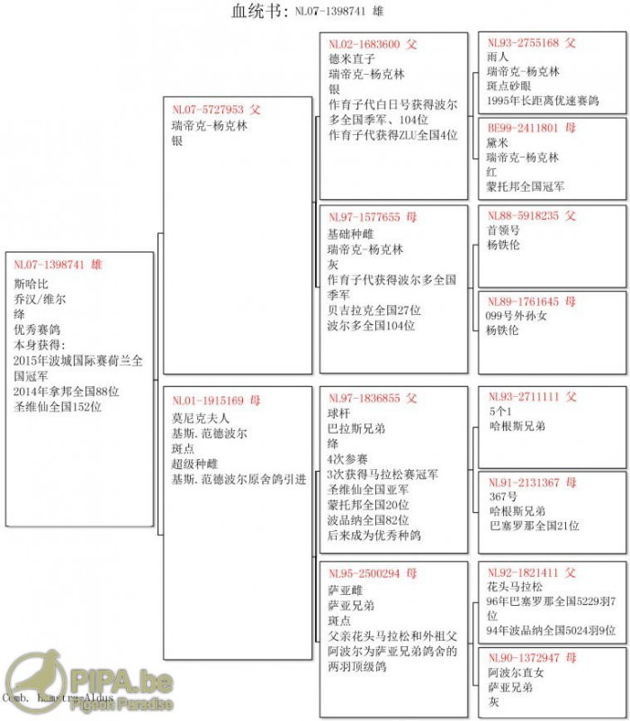 獲得2015年波城(Pau)荷蘭全國3.433羽冠軍(國際賽9.062羽20位)為哈姆斯特拉-阿爾杜斯(Hamstra-Aldus)鴿舍,該舍冠軍鴿NL07-1398741紅公是在比利時時間星期六早期9時2分27秒歸巢,翔距1014.07公里,創下平均分速853.99 米/分。