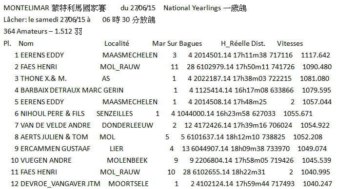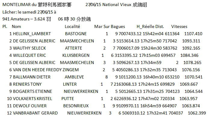 2015年的比利時蒙特利馬(MONTELIMAR)國家賽,6月24日集鴿總數5.124羽較去(2014)年4.340羽多了784羽,於6月27日(星期六)早上6時30分放鴿。