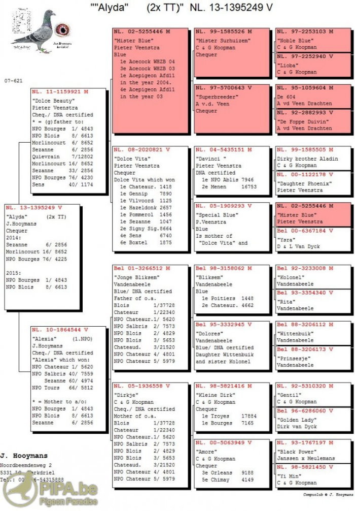 "阿萊達"的父親"英俊帥哥"(Dolce Beauty),是一羽彼得.文斯特拉品系鴿,出自兩羽超級種鴿的配對"灰先生"(Mr. Blue)x"美麗人生"(Dolce Vita),其母親"美麗人生"可以說是最為成功的賽雌了。
