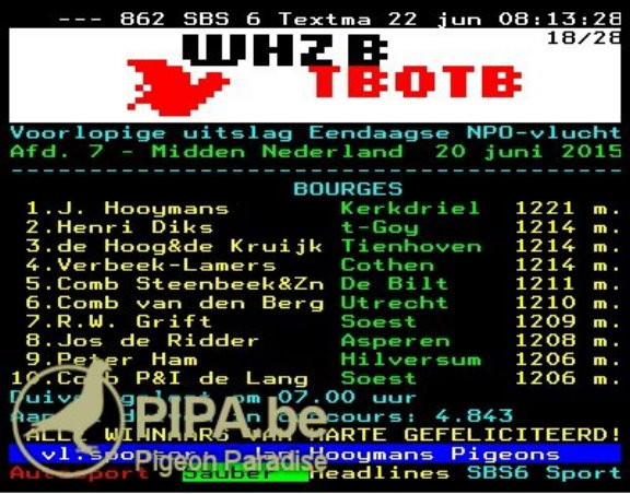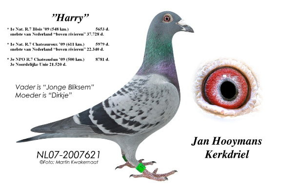 瑞克.賀爾曼(Rick Hermans)獲得了比利時查特路全國冠軍,吉拉德.考夫曼獲得了NPO蘇普斯冠軍。顯而易見,"哈利"血系持續地在國際賽層面上贏得勝利。而大師級鴿友楊.胡曼斯怎能屈居人後呢:他的鴿子"阿萊達"(Alyda)在NPO波治賽中獲得4.842羽分速最快鴿,為位於凱爾克德里爾的這家鴿舍錦上添花,再獲殊榮!