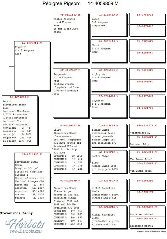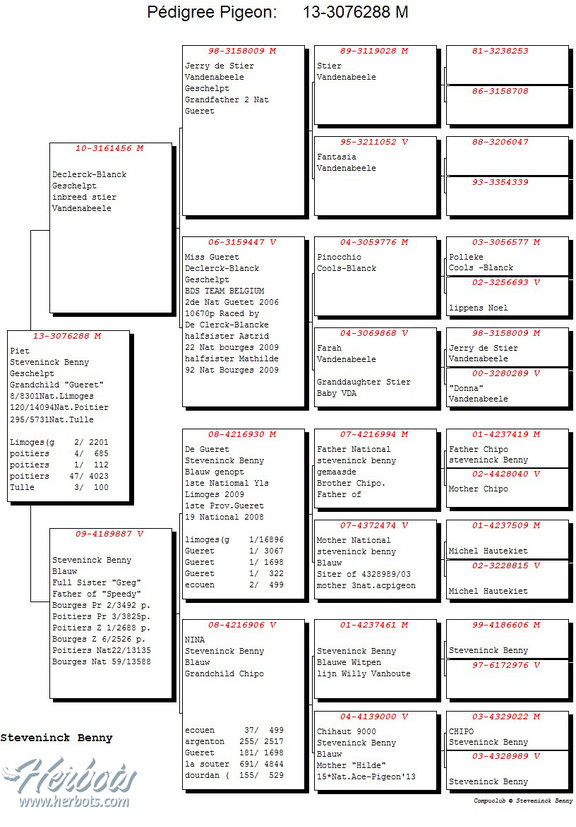 多年來賓尼受益於世界名鴿"氣魄號B03-4329022班公"留下的遺產。這羽鴿子繁育的後代表現非凡,國家賽和省賽的勝利,全國和省鴿王…而且它們不僅在賓尼鴿舍建功立業,而且和JBJ.吉林克斯,吉拉德.考夫曼和德克勒克-布蘭科鴿舍的聯合育種也取得了成功。你可以在下面的兩張血統書上一窺端倪。