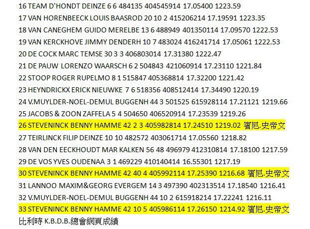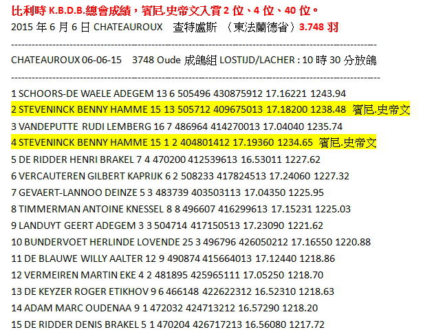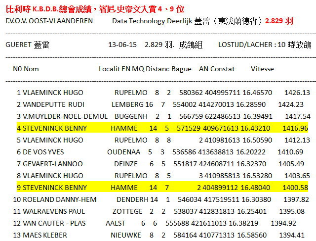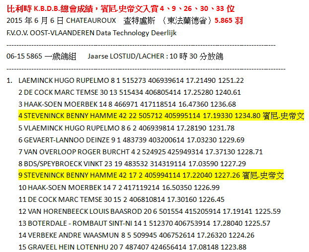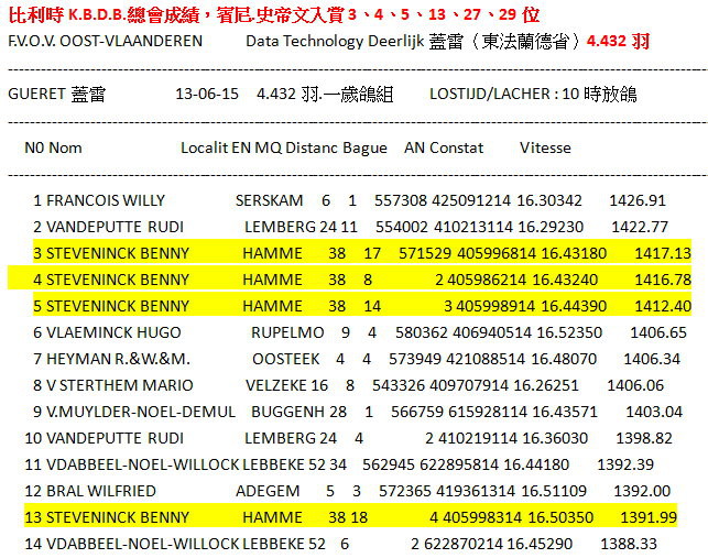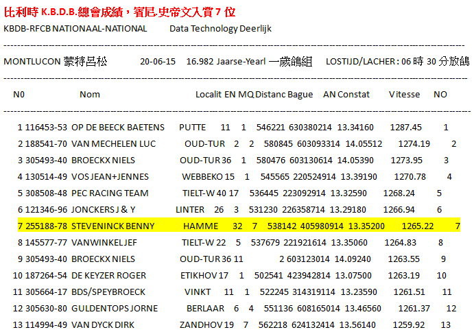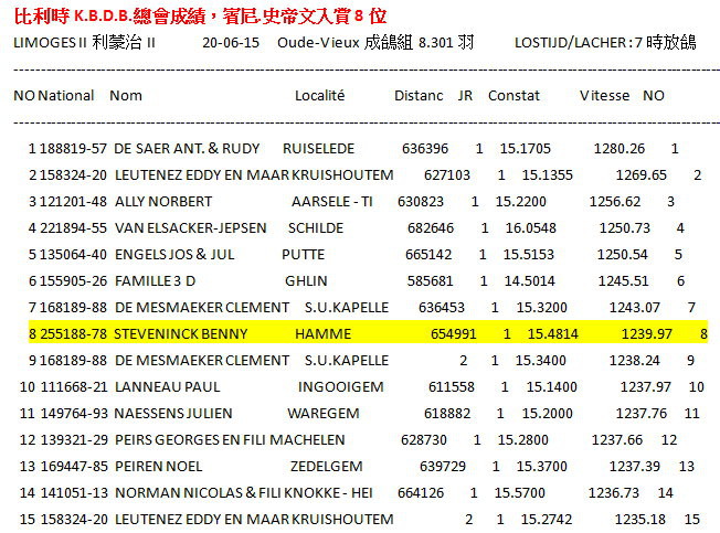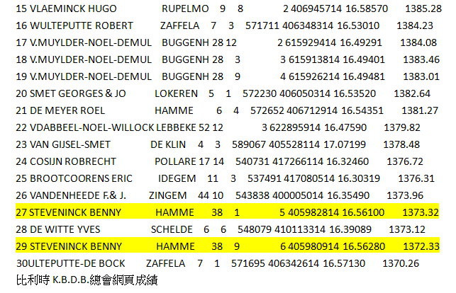 6月20日和21日,對來自Hamme的賓尼和卡琳.史帝文(Benny Steveninck)鴿舍而言是一個愉快的週末。他們獲得了比利時蒙特呂松全國一歲鴿組16.982羽7位及利蒙治II全國成鴿組8.301羽8位等優異成績。