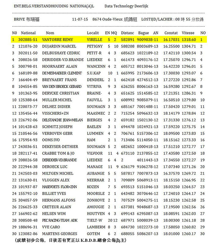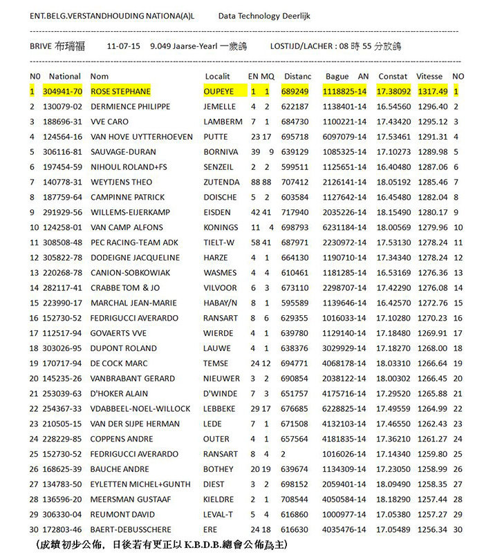 2015年比利時布瑞福(Brive)國家賽於7月8日交鴿,總數17.722羽(含8.673羽成鴿和9.049羽一歲鴿),於7月11日早上8時55分放鴿。