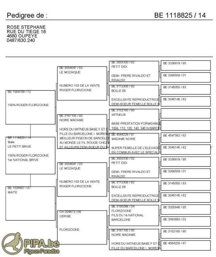 比利時布瑞福全國"一歲鴿組9.049羽"冠軍為羅斯.斯特凡尼(ROSE STEPHANE)鴿舍,該舍冠軍鴿B14-1118825銀公於當日下午17時38分09秒返舍,翔距689.249公里,創下平均分速1317.33米/分的佳績。