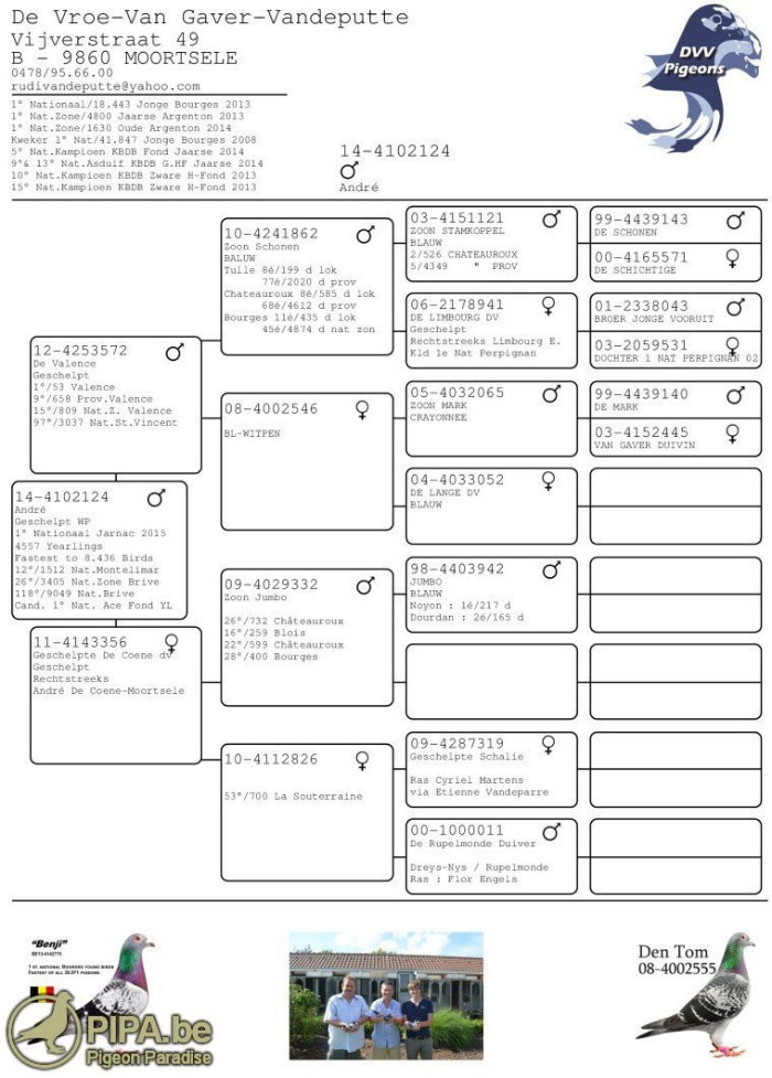 獲得2015年比利時賈納克全國"一歲鴿組4.557羽冠軍為迪佛-凡哈佛-凡德普特組合(DE VROE-V.GAVER J,T&M)鴿舍,該舍冠軍鴿B14-4102124班白羽.公,於比利時時間當日下午17時16分53秒返舍,翔距649.923公里,創下平均分速1210.55米/分,獲得全國"一歲鴿組4.557羽冠軍,同時也是賈納克全國賽總數8.436羽的總冠軍鴿。