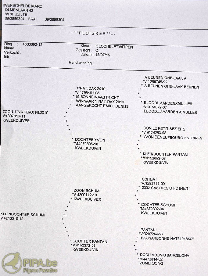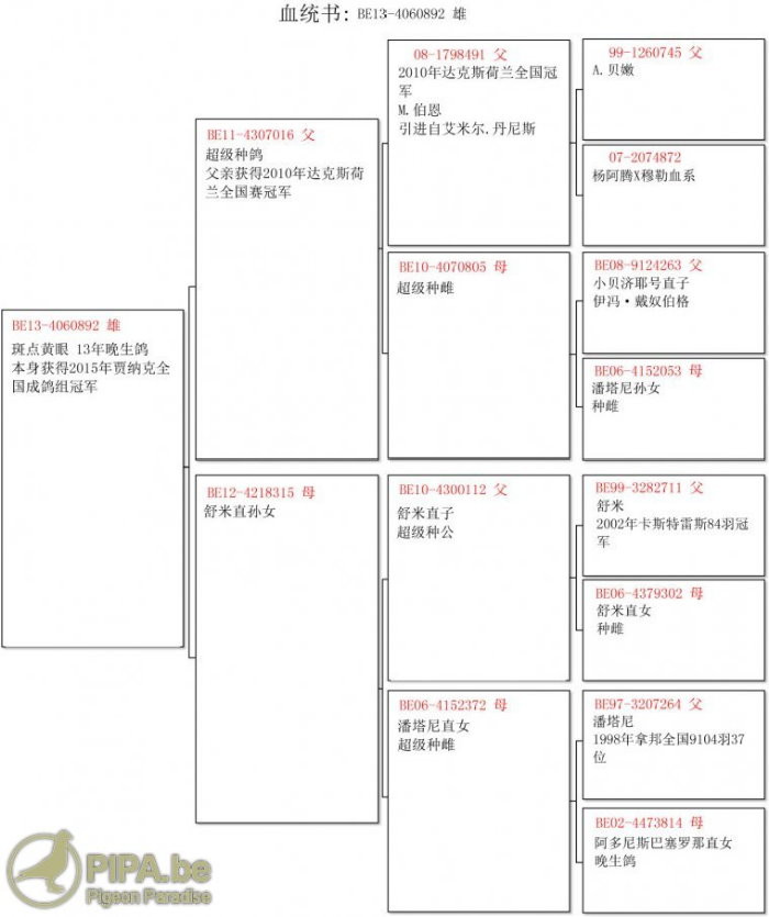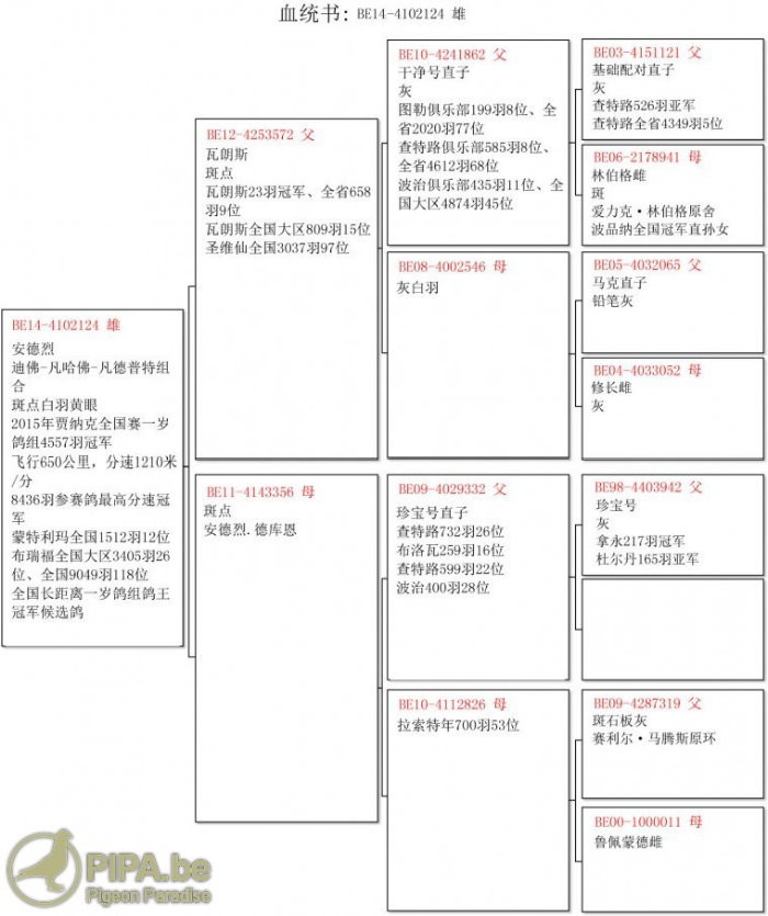 B14-4102124班白羽.公,比利時賈納克全國賽總數8.436羽的總冠軍鴿 中文翻譯血統書