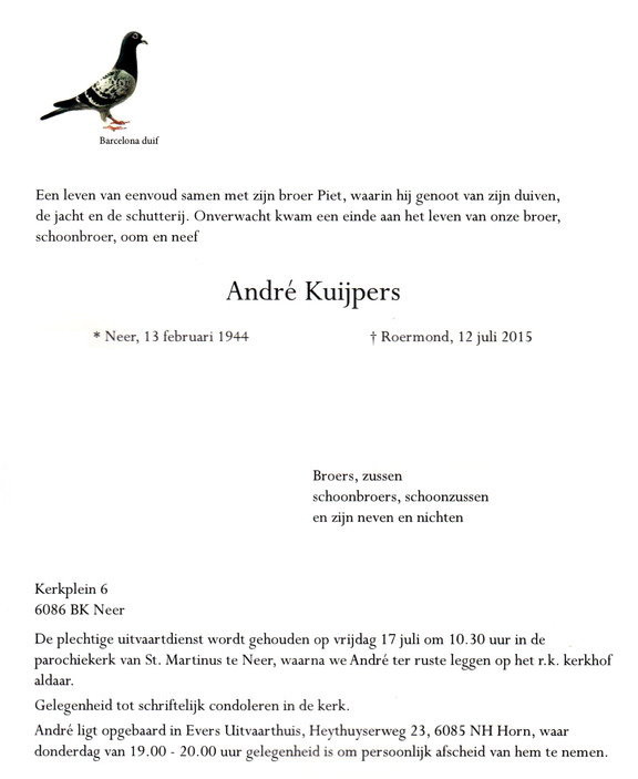 比利時長距離老將古伯兄弟鴿舍中的兄長 "安德列.古伯"(Andre Kuijpers)先生於2015年7月12日逝世,享年71歲。 我們誠摯的哀悼之情,請彼得和家人節哀