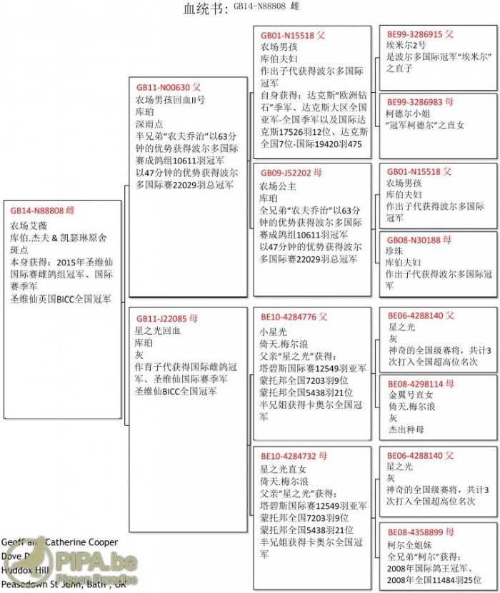 2015年聖維仙國際賽10.737羽總季軍(國際賽雌鴿組總冠軍)GB14-N88808 班.母.農場艾薇血統書