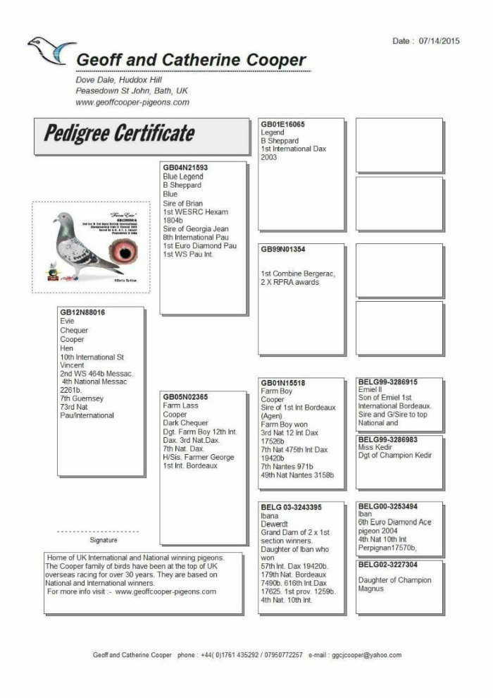 2015年聖維仙國際賽英國全國冠軍為強豪庫伯.傑夫&凱薩琳(Cooper Geoff & Catherine)夫婦鴿舍,該舍冠軍鴿GB14-N88808 班母."農場艾薇"是在比利時時間星期五晚上20時02分55秒歸巢,翔距853.304公里,創下平均分速1069.41 米/分獲得聖維仙國際賽全英國298羽冠軍,國際10.737羽總季軍(國際賽雌鴿組總冠軍),緊接著第二羽歸返鴿GB12-N88016班母"農場伊薇"也在20時14分17秒歸巢獲得全國第3位,國際賽10.737羽排名10位佳績。