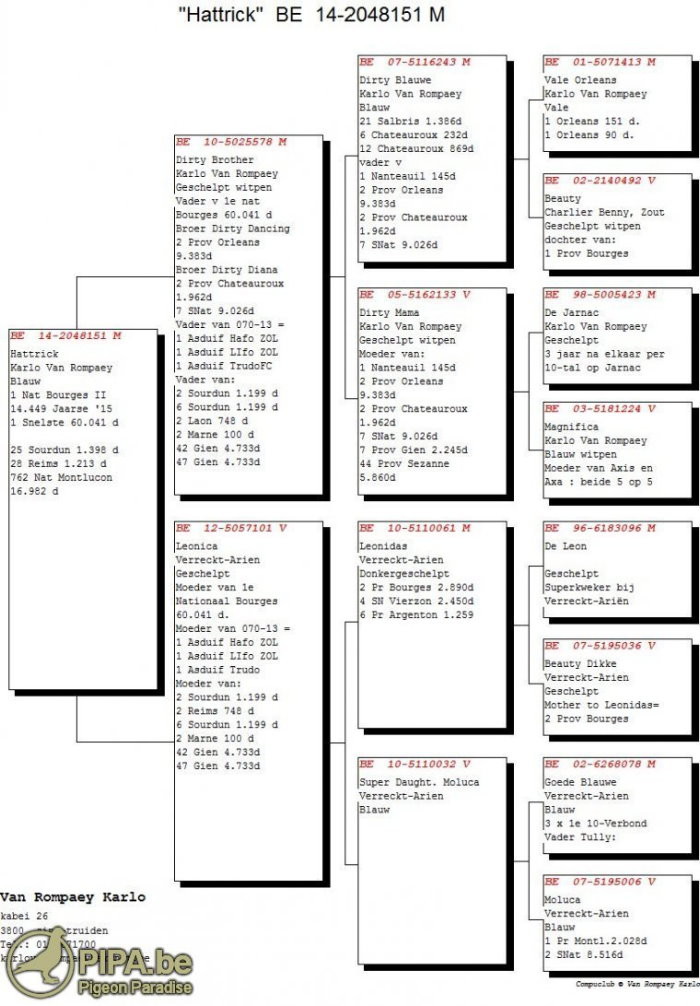 獲得比利時波治II (Bourges II)國家賽(一歲鴿組14.449羽)冠軍為范隆佩.卡羅(Van Rompaey Karlo)鴿舍,該舍冠軍鴿B14-2048151灰公是在比利時時間星期六下午15時07分57秒歸巢,翔距463.459公里,創下平均分速1259.57 米/分,除獲得波治II一歲鴿組14.449羽冠軍,更是全部交鴿總數60.041羽的總冠軍鴿。