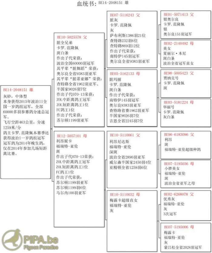 比利時波治II全國總數60.041羽總冠軍B14-2048151灰公 中文翻譯血統書