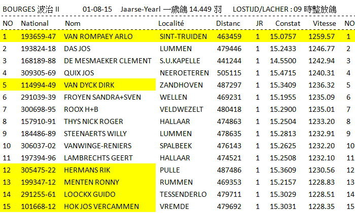 2015年比利時波治II (Bourges II)國家賽,於7月30日交鴿,於8月1日(星期六)早上9時整準時放鴿,包含(成鴿9.277羽、一歲鴿14.449羽、幼鴿36.315羽),總計60.041羽參賽,較去(2014)年48.326羽多了11.715羽。