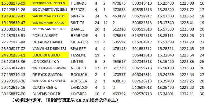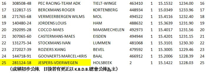 其他在幼鴿組全國36.315羽當中,國內鴿友較熟悉的名字有12位、25位的傑普斯.萬德維根(JESPERS-VDERWEGEN)鴿舍等。