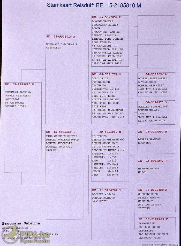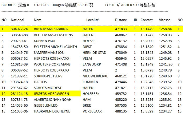 獲得波治II國家賽(成鴿組36.315羽)冠軍為布魯曼.薩布麗娜(Brugmans Sabrina)鴿舍,該舍冠軍鴿B15-2185810.斑公.黃眼.是在比利時時間星期六下午15時14分49秒歸巢,翔距471.833公里,創下平均分速1258.84 米/分,也是全部參賽鴿60.041羽分速總亞軍鴿。