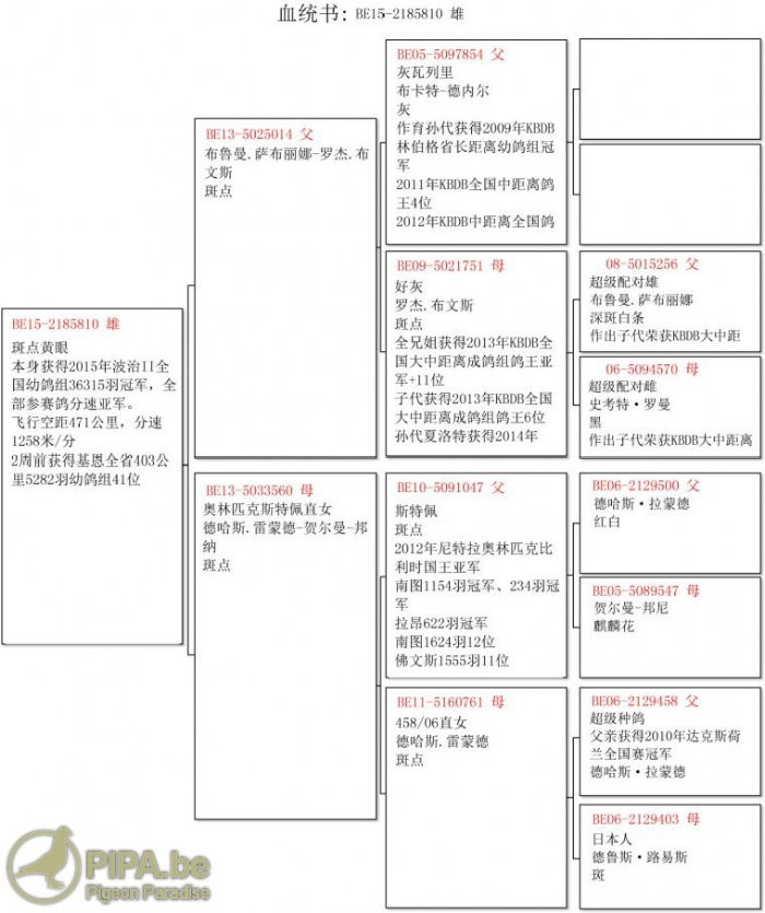 2015年比利時波治II全國幼鴿組36.315羽冠軍鴿B15-2185810.斑公.血統書