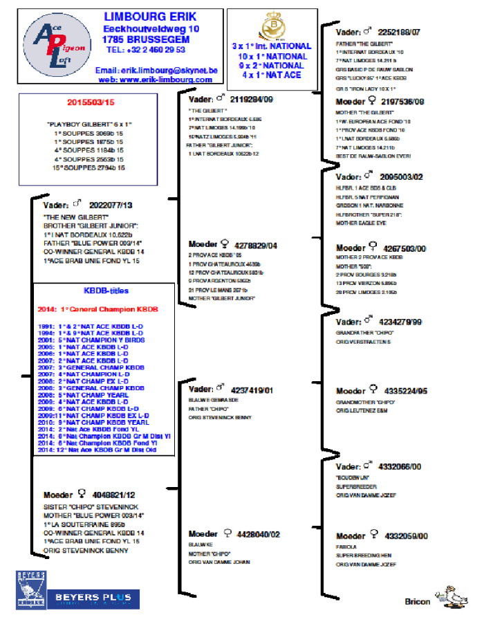 實際證明,"花花公子吉伯特"的父母鴿是艾力克同事吉爾特的無價育種配對。這個配對作出的另一羽雄鴿"灰勁力003號"(Blue Power 003 ,BE14-2151003灰公),也在愛艾力克的賽鴿舍中嶄露頭角。這羽"花花公子吉伯特"的全兄弟,是2014年KBDB綜合鴿舍獎冠軍功臣,在2015年獲得了布拉邦聯合會長距離一歲鴿王冠軍。以下是他所獲得成績: