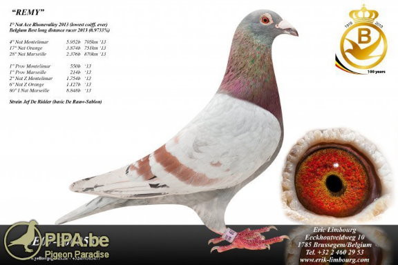 "雷米"(539/07,Remy)為比利時溫克塞勒(Winksele)的史貝爾多恩(Speltdoorn)獲得了2013年隆河谷全國鴿王冠軍。而在此之前,"雷米"已經獲得了蒙特利馬全國4位、橘郡全國17位、馬賽全國28位。艾力克.林伯格毫不猶豫就將這羽鴿子加入到自己的藏鴿之中。實際證明,這是林伯格賽鴿生涯的又一項明智的舉措。這羽鴿子與"神奇苗條女"(Magic Slimmen,BE09-2230725)配對,作出了KBDB全省大中距離幼鴿鴿王季軍&利蒙治全國6272羽26位得主"派翠西亞"(Patricia,BE14-2151002)。"神奇苗條女"本身是2006年KBDB全國超長距離鴿王冠軍"斯蒂凡諾"(Di Stefano)的孫女。"派翠西亞"的同窩兄弟"斯巴達雷米"(Spartacus Remy,BE14-2151001)將會獲得KBDB全國超長距離一歲鴿王6位。請點擊此處,查看這對同窩兄妹的血統書。"斯巴達雷米"以以下成績,證明了自己的實力: