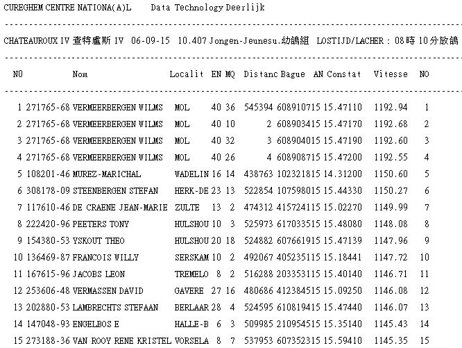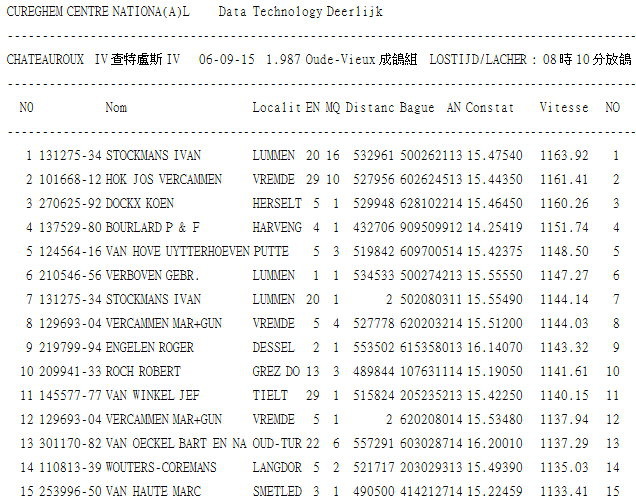 2015年比利時查特盧斯IV(Chateauroux IV)國家賽是今年最後一次的全國賽,9月3日集鴿完成,距離約480~500公里(含成鴿1.989羽、幼鴿10.407羽)總計12.396羽預定於9月5日(星期六)上午要放鴿,因天氣不佳延後一日6日(星期日)上午8時10分放鴿。