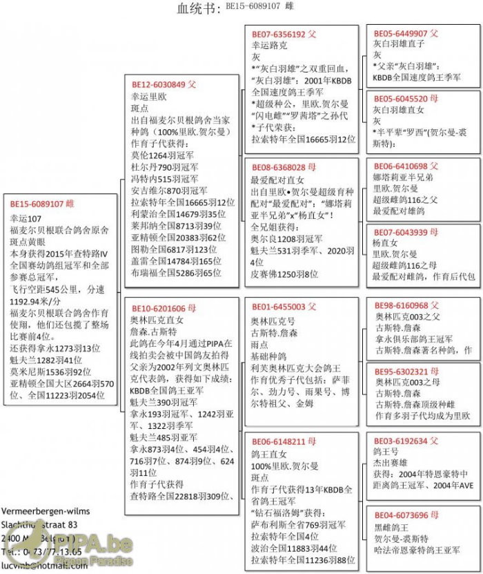 ★2015年查特路全國賽成鴿組1.989羽冠軍中文血統書資訊: