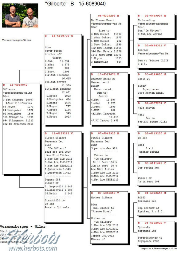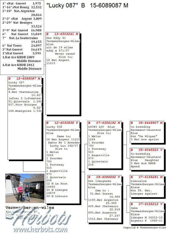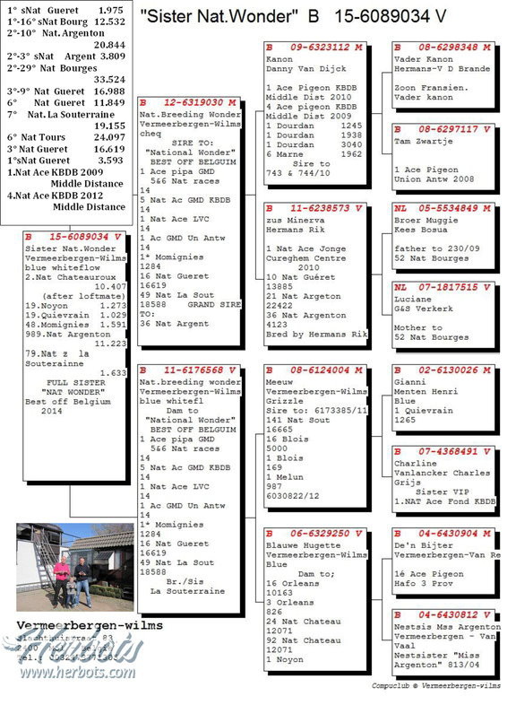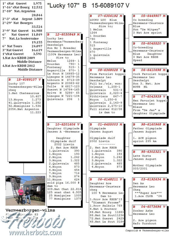 獲得比利時查特盧斯IV(Chateauroux IV)幼鴿組10.407羽全國冠軍為福麥爾貝根聯合(Vermeerbergen)鴿舍,該舍在這次查特盧斯IV全國比賽裡,演出帽子戲法計入賞冠軍、亞軍、季軍、殿軍等前4名的優異成績。該舍冠軍鴿是在比利時時間星期日下午15時47分11秒歸返,空中距離545.394