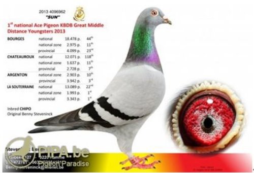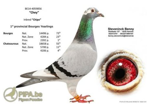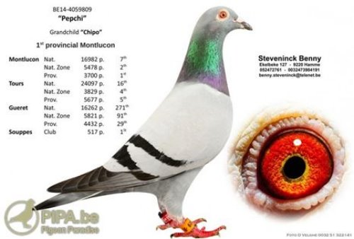“皮普契”是賓尼2014年作出的頂尖品質鴿。他在出生的當年就嶄露頭角,獲得了杜爾斯全國B1大區幼鴿組3.829羽4位,在全國幼鴿組24.097羽中獲得16位。