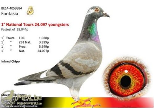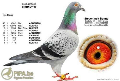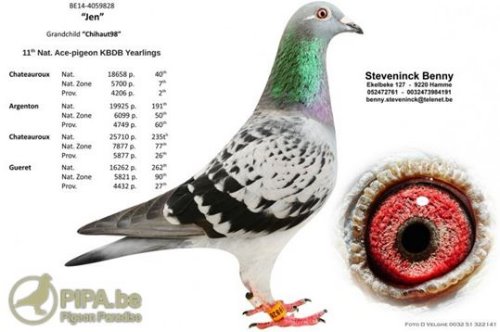 這羽賽鴿是本賽季的明星鴿。他在7月11日的查特路II中獲得一歲鴿4.206羽冠軍,在全國大區5.700羽中獲得5位、在全國18.658羽中獲得13位。在查特路II的此前幾周的蓋雷I中,他還獲得了全省一歲鴿4.432羽5位、全國62位。他還獲得了波治全省一歲鴿4.668羽6位。