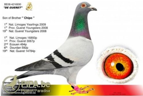 “蓋雷號”(GueretBE08-4216930):利蒙治全國一歲鴿16.893羽冠軍、蓋雷全省幼鴿3.067羽冠軍、全國14.784羽19位。