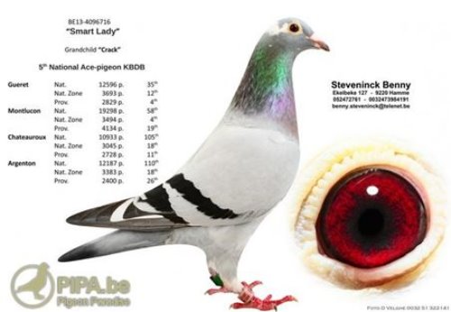 “聰明女郎”(Smart LadyBE13-4096716):蓋雷全省4位、2014年蒙呂松全國大區4位、查特路全省11位、2015年KBDB長中距離全國成鴿鴿王4位等等……