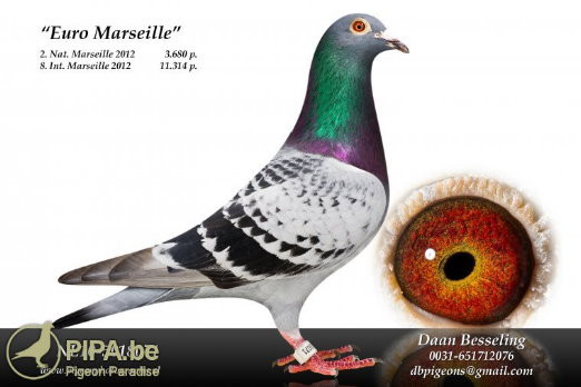 "歐洲馬賽號"(Euro Marseille NL10-5018071班公)是唯一一羽荷蘭賽鴿,他在放飛日當天(2012年7月22日)歸巢,打鐘時間為22:44,飛行空距為945 km。這樣的表現令人側目,因為比起國際賽冠軍他還要多飛行227公里(打鐘是18:23).最終"歐洲馬賽號"取得了全國賽亞軍,國際賽11.314羽8位。"歐洲馬賽號"的血統書表明了他能夠取得如此輝煌成績的原因:他的父母為2羽傑出種鴿