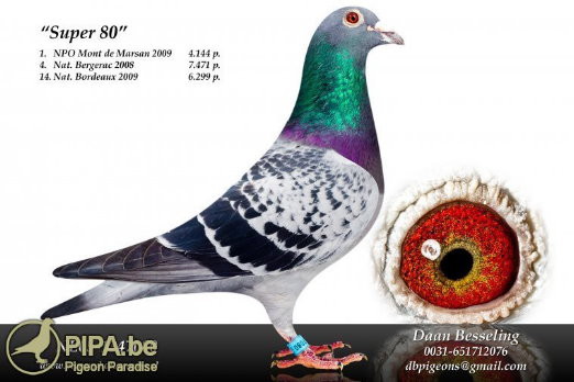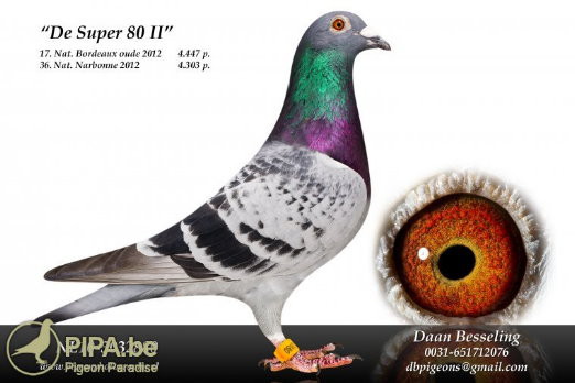 "超級80 II 號"與布洛坎普超級長距離鴿配對時完美詮釋了"超級80"的育種價值。"超級80 II號"贏得了2012年ZUL波爾多全國賽4.447羽17位 和2012年拿邦全國賽4.303羽39位。他還獲得2012年WHZB全國鴿王5位。他還獲得2012年ZLU鴿王5位。"超級80 II號"的外祖父"波品納06"( Perpignan '06 DV06720-02-601)贏得了2006年波品納全國冠軍和國際賽亞軍。