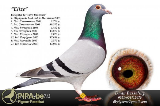"歐洲馬賽號"的母親為"伊莉絲"(Elize),她來自達恩的朋友布洛坎普父子。她是布洛坎普著名種鴿"歐洲鑽石"( Euro Diamond DV06720-02-537班公)的直女。"歐洲鑽石"被認為是世界上最優秀的長距離賽鴿。他在全國賽贏得了不少於4次前5位成績(還有3次入賞國際賽),而他還贏得了2007年奧斯坦德E類奧林匹克代表鴿冠軍。"伊莉絲"的母親出自"喬治號"( George BE99-4528985)。"尊爵"(Mistral DV06720-03-859)獲得了奧斯坦德奧林匹克E類馬拉松亞軍,半兄弟"歐洲鑽石"則獲得冠軍。查看"伊莉絲"的血統書。