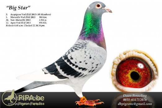 "歐洲鑽石號"的曾孫,他顯示了"歐洲馬賽號"並非等閒之輩。"大明星"在馬賽賽取得了佳績。2013年他贏得了馬賽全國賽2.916羽36位,在當年的阿讓賽中表現也很出色8:40放飛,飛行空距895公里,他在晚上10:30歸巢,這是令人難以置信的成績。他飛行了幾乎14小時才回到位於奧斯特韋克的鴿舍。