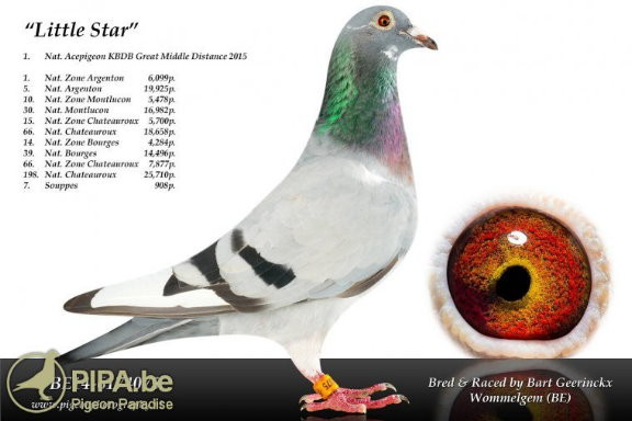 "賽鴿運動需要耐心,這是不斷嘗試和犯錯的過程。你需要從錯誤中吸取經驗而且不能氣餒。保持自己的信心",這是路克.吉林克斯在10年前給予的建議。兒子巴特和負責鴿舍日常管理的好友尤爾根聽從路克的建議,然而他們並不真得需要多少建議:巴特和尤爾根在路克過世的3年半時間裡,贏得了賽鴿運動中幾乎所有榮譽。兩位好友贏得了眾多全省、大區和全國冠軍桂冠,還有一些鴿王頭銜甚至奧林匹克代表鴿,這些都是在僅僅4個賽季內獲得的。他們將路克留下的遺產發展成為一支實力鴿系,令全世界眾多鴿友羡慕,最近更是如此。這是對巴特的父親最好的告慰。巴特和尤爾根憑藉小明星號(Little Star BE14-6174075灰白羽.母)贏得2015年全國中長距離一歲鴿組鴿王冠軍進一步提高了自己的聲譽。