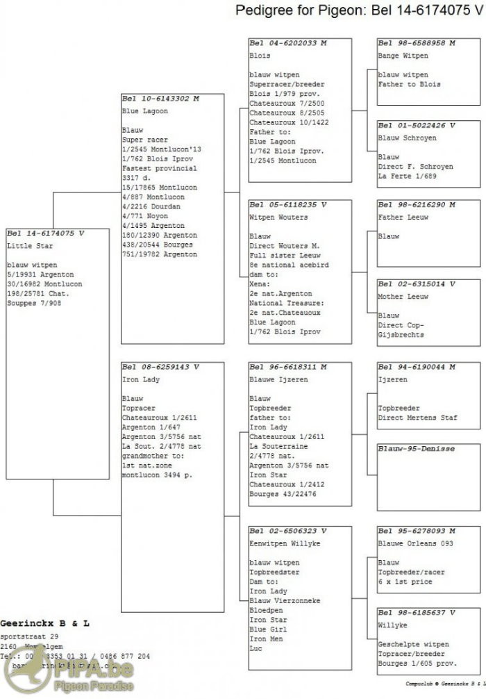 "小明星"的母親"鐵血女郎"(Iron Lady 143/08),出自"威利雌"(Willyke)和 "灰鐵人"(Blauwe Ijzeren),這是吉林克斯最重要的兩支血系。"鐵血女郎"是一羽成功賽鴿,贏得了查特路全省2.661羽冠軍、亞精頓全省647羽冠軍(全國5.756羽季軍)和拉索特年全國4.778羽亞軍。因為這樣的出色表現,巴特決定將其轉入種鴿舍。她的孫代獲得蒙呂松全國大區2.494羽冠軍。查看"小明星"的完整血統書。